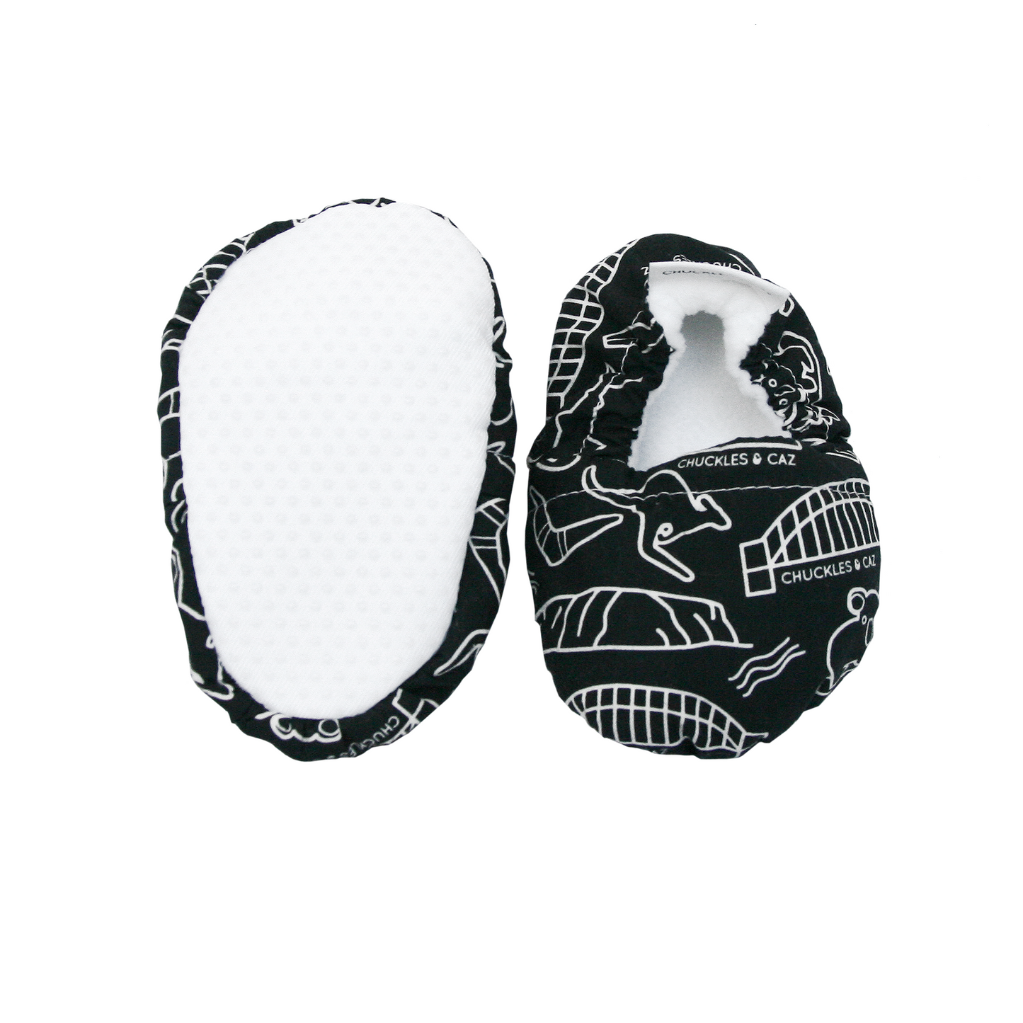 Recommended by paediatricians & podiatrists, soft soled shoes promote good balance, help develop strength & grasping action of little toes. With 100% Cotton outer, soft Micro Fleece lining, elasticised heel & grip soles, our booties keep little feet comfy while helping to prevent any slipping & sliding as they start learning to crawl & walk.